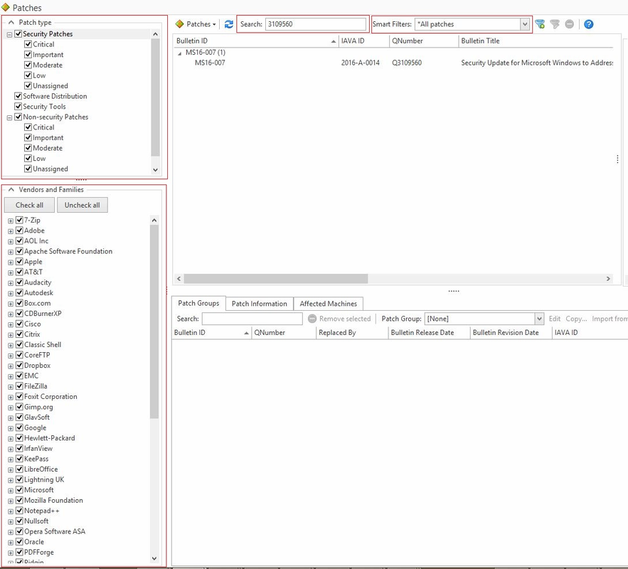 - Vergewissern Sie sich, dass alle'Vendors and Families' in der linken unteren Ecke der Patch-Ansicht markiert sind.