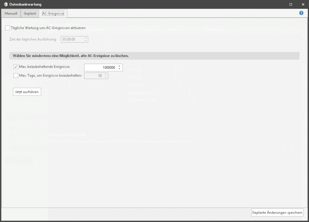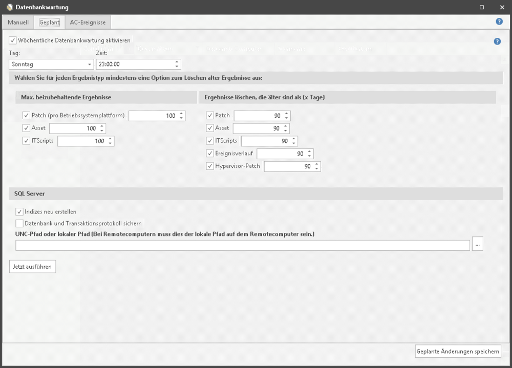 | Jetzt ausführen | Startet sofort die Aufgabe zur Datenbankwartung. Die Aufgabe wird im Hintergrund ausgeführt und erfordert keinen Benutzereingriff. Die Aufgabe wird mit der aktuellen Konfiguration durchgeführt. Die aktuelle Konfiguration wird für die zukünftige Verwendung gespeichert. Wenn das Kontrollkästchen Wöchentliche Datenbankwartung aktivieren aktiviert ist, wird auch die Aufgabe der Datenbankwartung geplant. Sie können das Protokoll der Ereignisanzeige verwenden, um den Fortschritt der Wartungsmaßnahme zu verfolgen. Darüber hinaus sollte es nach Abschluss der Aufgabe weniger Elemente in der Ergebnisliste und in der Liste der Datenbankverwaltung geben. Wenn Sie Zugriff auf das SQL Server Management Studio haben, können Sie auch die Funktion Datenbankeigenschaften verwenden, um den Fortschritt der Aufgabe zu verfolgen. |