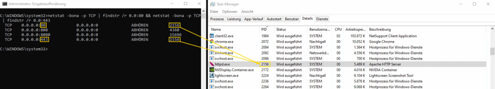 Wollen Sie jedoch wissen, durch welche Programme derzeit der Port 80 und Port 443 belegt ist, so geben Sie folgenden, verknüpften Befehl ein: