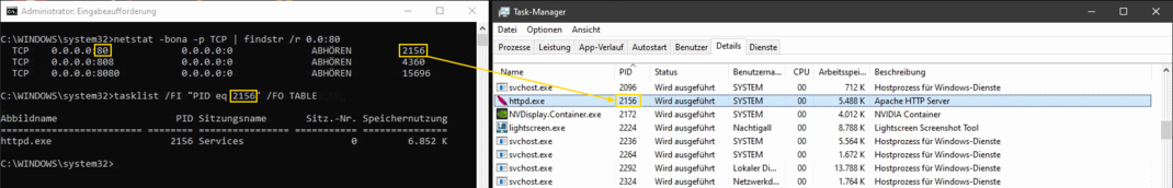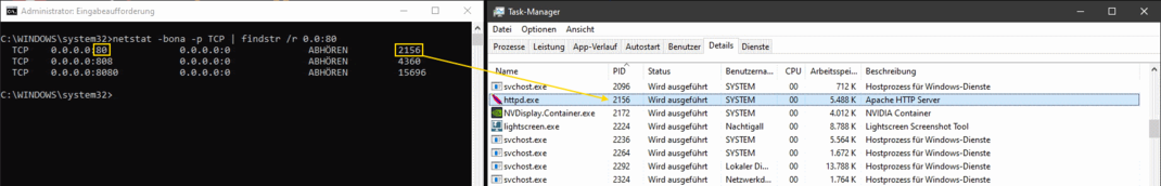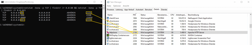 Als Ergebnis stellen wir fest: Port 80 und Port 443 wird auf diesem Rechner durch den Apache HTTP Server verwendet.