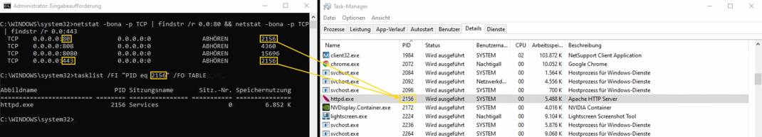 In diesem Beispiel belegt das Programm mit der Prozess-ID 2156 sowohl den Port 80, als auch den Port 443
