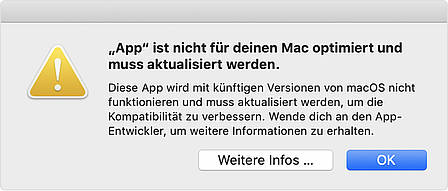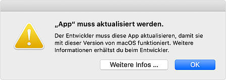 Haben Sie jedoch bereits das Upgrade auf macOS Catalina 10.15 durchgeführt, so erhalten Sie die Meldung, dass die App aktualisiert werden muss.