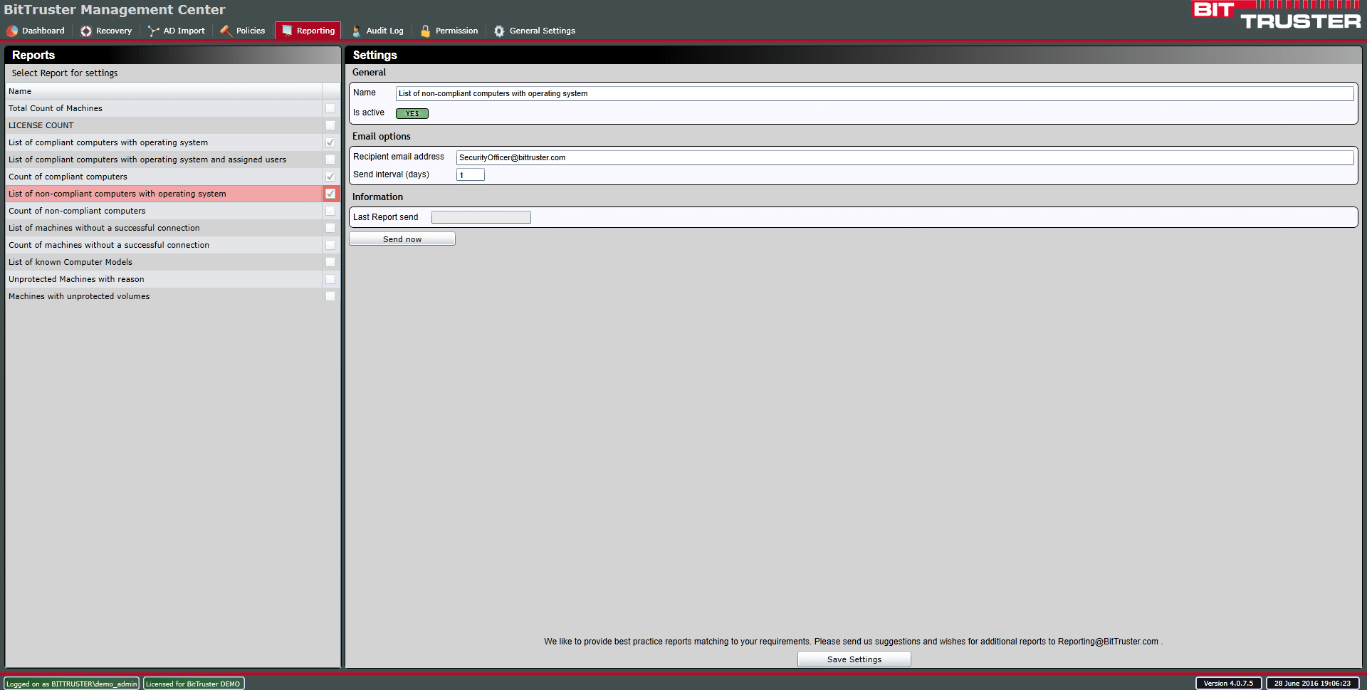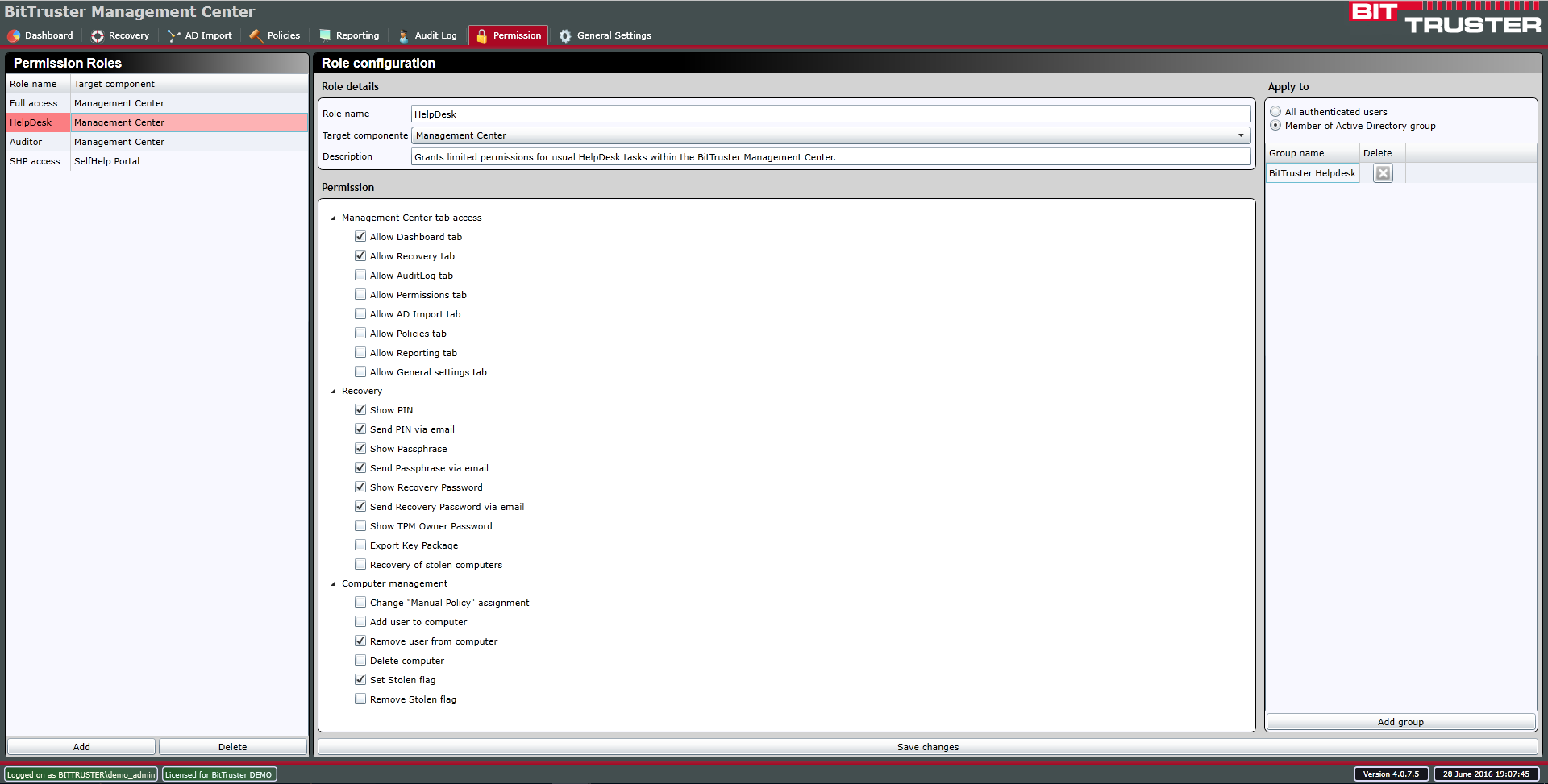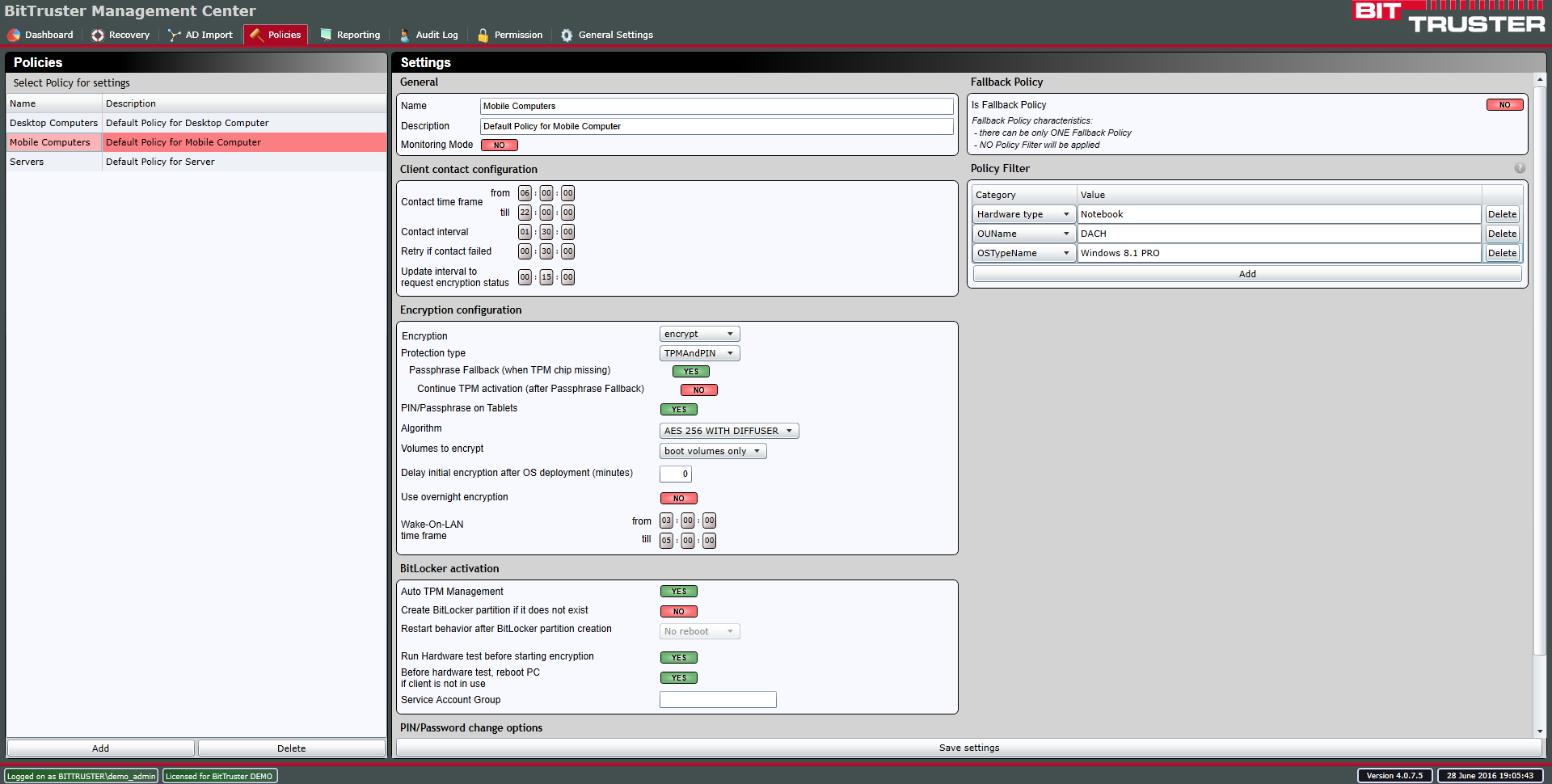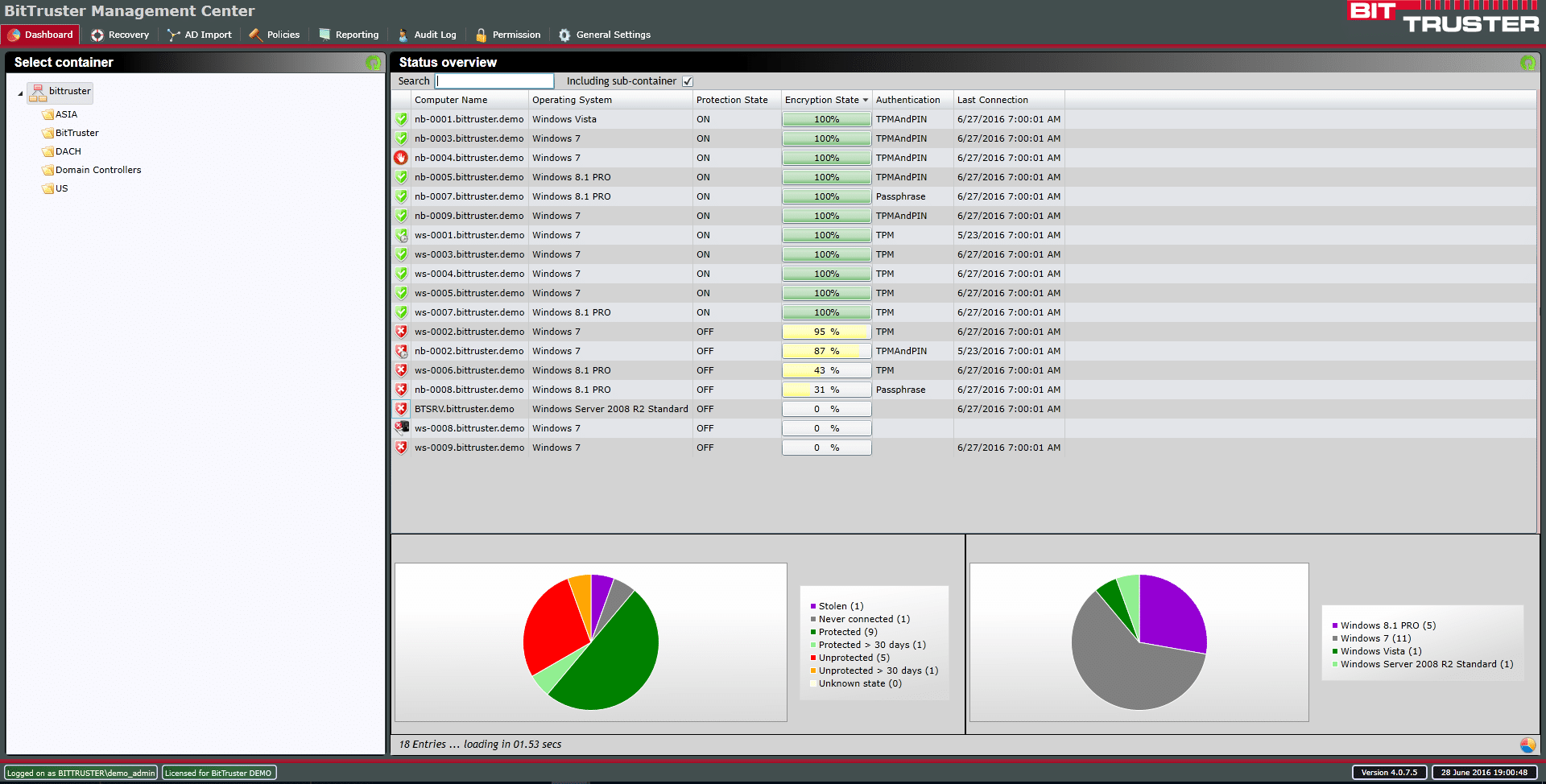 Mit der Management-Konsole werden alle Funktionen wie Zugriffsberechtigungen, Zuordnungen, gestohlene Notebooks usw. zentral administriert. Die Konsole arbeitet rollenbasiert und alle dort durchgeführten Vorgänge werden umfangreich und nachweisbar protokolliert. Im Falle des Verlusts eines mit BitLocker verschlüsselten Notebooks bzw. Tablets, handelt es sich durch die installierte Festplattenverschlüsselung um keinen Datenschutzvorfall. Der Nachweis, dass BitLocker zu diesem Zeitpunkt aktiviert war, muss jedoch geführt werden können.