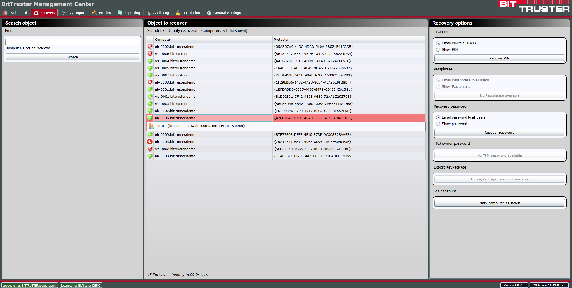 - Schlüssel-Management für TPM PIN und Recovery Passwort. Speichern Sie diese essenziellen Keys zur Wiederherstellung in einer sicheren (Unternehmens-) Datenbank. Durch das BitLocker-Recovery ist der Datenzugriff jederzeit gewährleistet. Alle wichtigen Daten für die Wiederherstellung bleiben im Unternehmen